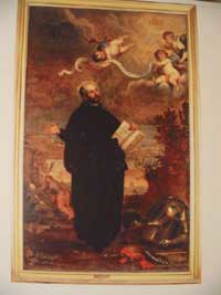 | We start our visit with a brief encapsulation of the life of St. Ignatius, seen in the oil painting here. One of 13 children, he was born Inigo Lopez de Loyola in 1491. From petty Basque nobility, Inigo grew up much like many a nobleman: as a card shark, a military hero, and a ladies man. After a cannonball shattered his shin, he traded in his youthful escapades for a new life. Longing to outdo the saints and martyrs of days gone by, he changed his name and dedicated his energies entirely to Jesus, organizing a corps of young men that would dedicate themselves to defending both Catholicism and the Pope. Founding the Compagnia di Gesù (later becoming the Jesuit Order), he became its first General Superior.