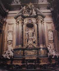 | The Gesù church, which Ignatius wanted but never saw built, is right next door to the Casa Professa. It offers us its colorful history and stunning Baroque decorations. Ignatius' own magnificent altar can be seen in the picture above.