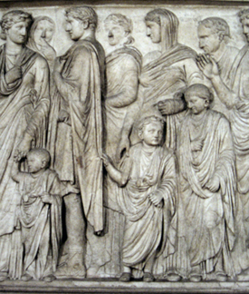 In 13 B.C., the Senate pledged the Ara Pacis or Altar of Peace to Augustus as a token of its appreciation for the political, economic, and social harmony that Augustus had ensured Rome and her territories. In the marble friezes of the altar, scene of Rome’s foundation legends alternate with parades in which Augustus, his family members, friends, their children, and wives figure prominently together with high priests, religious officials, and high-ranking politicians. The great communicator stated his message clearly: through family, dynasty; through dynastic succession, the contin