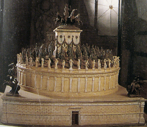 For over a decade, the young Octavian remodeled Roman government to suit his needs. When awarded the title “Augustus” in 28 B.C., Caesar’s adopted son could finally claim to have achieved his goals: he had outmaneuvered his political opponents, survived decades of civil wars, and had concentrated the privileges, power, and responsibilities of the entire Senatorial body into his own hands. How? Not just through cunning and violence, but with the persuasive powers of art and architecture! To many historians’ surprise, Octavian immediately began work on his mausoleum -- during the chaotic years of civil war and social turmoil that followed Caesar's assasination. (The mausoleum can be seen monopolizing the center of the Fascist-era photo on the right.) By no means did this suggest that Octavian was angsting over the possibilities of a premature death. More than his last resting place, this behemoth burial provided for the future Emperor’s extended family. Adopted sons, adopted grandsons, sons-in-law, and stepsons were buried there. These were the men whom the Emperor groomed as heir to the newly found Empire. This was the beginning of Imperial dynasty. Just over a century later, the Emperor Hadrian very consciously modeled his reign on Augustus’. After all, the first Emperor of Rome was considered the founder of a golden age after putting an end to decades of civil war and ensuring peace throughout the Roman world. Hadrian decision was to father a second golden age and he marketed this idea by associating himself with Augustus’ architectural programs. For example, Hadrian rebuilt the Pantheon, which Augustus’ son-in-law had erected in his honor. He also built a mausoleum (which can be seen in the hypothetical reconstruction in the photo on the right). Not far from Augustus’, it copied the mausoleum that Augustus had built in order to strengthen Romans’ opinions that he would pacify the Roman world or die trying.