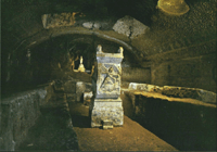 One of Rome's most famous underground sites is under the church, San Clemente. San Clemente is about halfway between the Colosseum and the basilica called Saint John in Lateran. In 1857, the Domincan Friar Mullouly who lived in the monastery at San Clemente (or Saint Clement) followed a hunch and started excavating beneath the "modern" church, which dates to the 1200s. He was rewarded with one of the most interesting discoveries of his time: there was beneath the existing church an early Christian basilica dating to sometime around 350 A.D. Mullouly continued digging, inspired by his enormous successes, and discovered yet another, more ancient, layer which dates to the first century A.D.